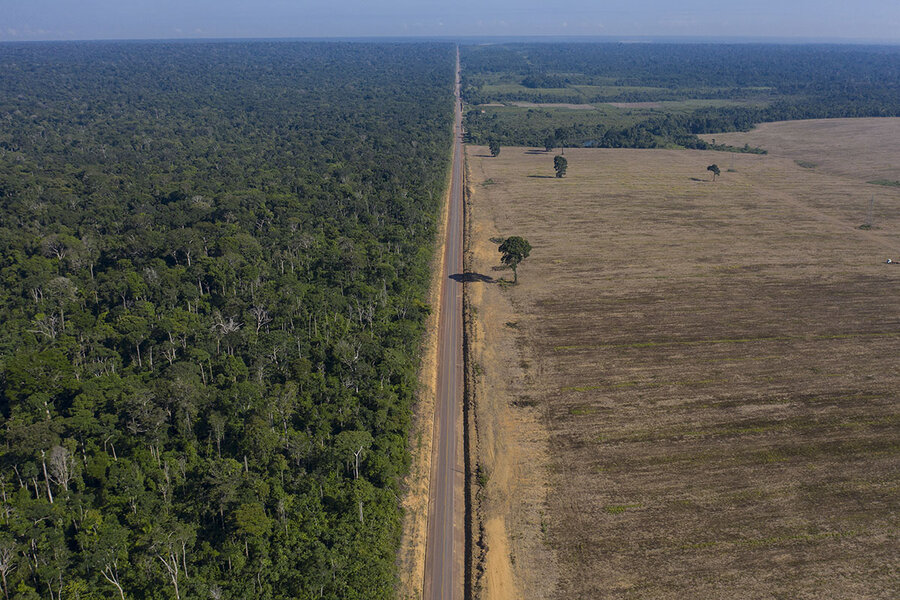 Highway BR-163 stretches between the Tapajos National Forest (left) and a soy field in Brazil. Brazil signed on to an international pledge to halt deforestation by 2030, announced on Monday at the United Nations' COP26 climate summit in Glasgow, Scotland.